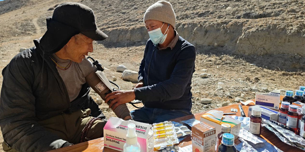 उपल्लो मुस्ताङीलाई स्वास्थ्य सेवा दिँदै गुरूङ