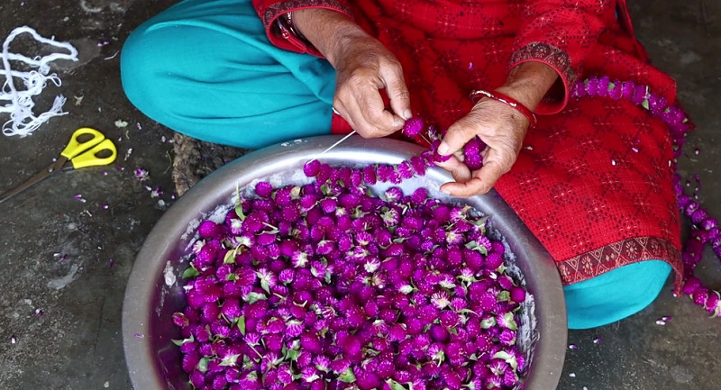 किसान मखमलीको फूल टिपेर माला बनाउन व्यस्त : उचित मूल्य नपाएको गुनासो
