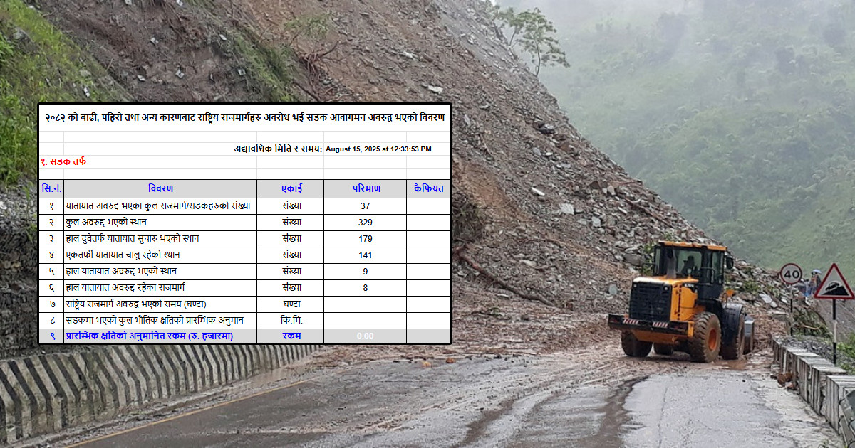 बाढी पहिरोका कारण मुख्य ८ सडक पूर्णरुपमा अवरुद्ध, १३९ स्थानमा एकतर्फी सञ्चालन