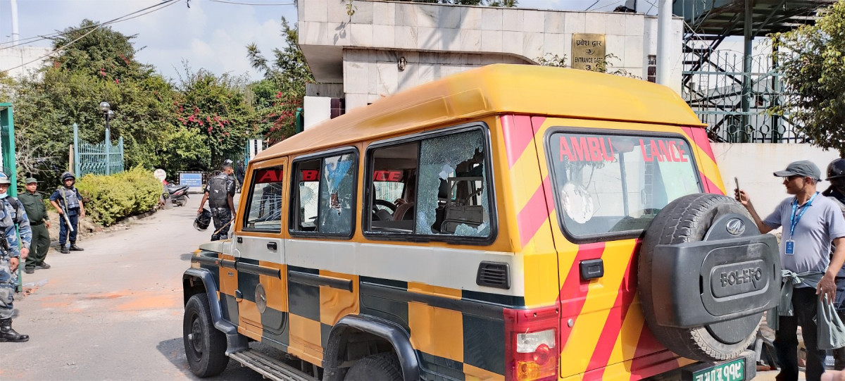 प्रदर्शनस्थलमा घाइते लिन गएको एम्बुलेन्समा तोडफोड
