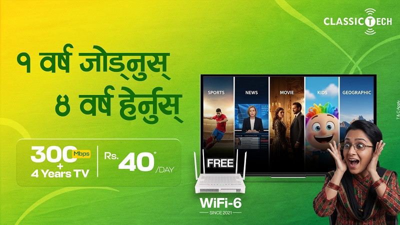 काठमाण्डाै – इन्टरनेट सेवा प्रदायक कम्पनी क्लासिक टेकले १ वर्ष जोड्नुस ४ वर्ष हेर्नुस् अफर सार्वजनिक गरेको छ । यस अफरमा अब ग्राहकले ३०० एमबीपीएस उच्च गतिको इन्टरनेट र आईपी टीभी जडानमा ४ वर्षसम्म आईपीटीभी सेवाका साथै वाईफाई सिक्स राउटर पनि निःशुल्क पाउने कम्पनीले जनाएकाे छ ।